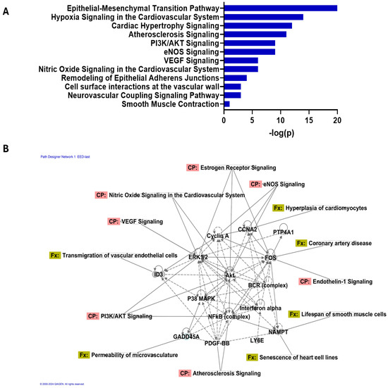 Integrated pathway and network analysis of peripheral arterial disease-associated gene interactions. (A) A bar plot illustrating the significant pathways identified by IPA in our study of 414 genes associated with peripheral arterial disease (PAD)-related vascular remodeling, environmental estrogenic endocrine disruptors (EEDs), and estrogen. The pathways are ranked by −log10 (p-value) indicating the level of upregulation in pathways. (B) The network presents the gene network analysis, revealing the intricate web of direct and secondary gene interactions and highlighting key nodes suggesting their central role in the molecular mechanisms of PAD-related vascular remodeling and the impact of EEDs on these processes.