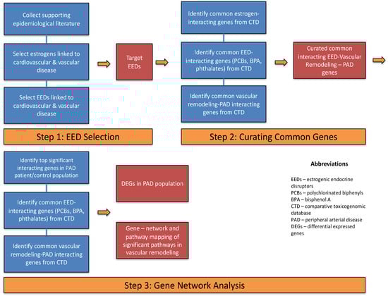 This study was conducted in three different steps: [1] selecting estrogens and EEDs to which exposure has an association with cardiovascular and vascular disease through previously published evidence via literature review; [2] identifying (a) common estrogen-interacting genes, (b) common EED (polychlorinated biphenyls (PCBs), bisphenol A (BPA), phthalates)-interacting genes, and (c) common vascular remodeling and peripheral arterial disease genes; [3] identifying and visualizing differentially expression genes in PAD; and [4] visualizing those particular gene networks and identifying their biological pathways and predicting candidate genes that can potentially mediate PAD outcomes via vascular remodeling. We used both the Comparative Toxicogenomic (CTD) and NCBI Gene Omnibus Expression (GEO) databases to support our study, as further discussed below. Figure 6 demonstrates the workflow of this study, and Table 1 shows the epidemiological and laboratory-based studies that show an association between EEDs and cardiovascular/vascular diseases.