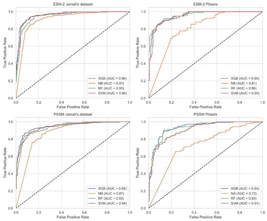ROC curves for different datasets using various features with a 5-fold CV on the test set. Abbreviations: SVM: support vector machine; XGB: extreme gradient boosting; NB: naive bayes; RF: random forest; AUC: accuracy; ESM-2: evolutionary scale modeling 2; ROC: receiver operating characteristic; CV: cross-validation.