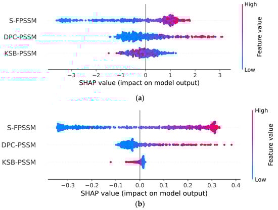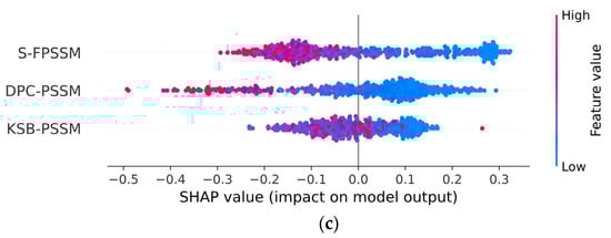 In the given equation,  is the value in the FPSSM’s th row and th column,  is the th amino acid in the protein sequence, and  is the th ranked amino acid in the PSSM. These three PSSM-based features enhance the classifier’s performance by fully capturing the evolutionary information in protein sequences. We conducted a SHAP analysis on the importance of three PSSM-based features using XGB as the classifier, following the explanatory framework introduced by Lundberg et al. []. SHAP leverages game theory principles to quantitatively evaluate the influence of various input features on prediction outcomes, which assess the average marginal contribution of each feature across all possible combinations, thus ensuring a fair attribution of each feature’s impact on model predictions.