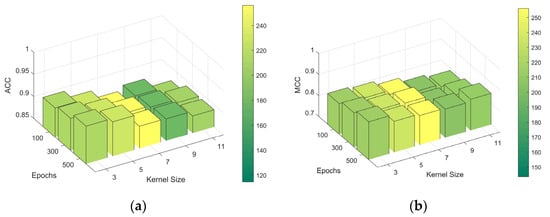 For the CapsNets, we trained them with different kernel sizes since they achieved the best results on Jamali’s dataset. The evaluation of the ACC and MCC on the independent test set is shown in Figure 4. This plot facilitated an understanding of the impact that different kernel sizes and epochs have on the model’s performance, revealing that a kernel size of three was the most effective for this dataset.