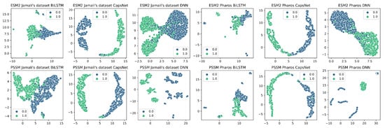 In Figure 5, we employed the Uniform Manifold Approximation and Projection (UMAP) [] to visualize the abstract features learned by different neural network architectures from high-dimensional data. This data was extracted from the second-to-last layer of each model, which typically contains the most meaningful representations for classification tasks, just prior to the final decision-making layer. In the plot below, 1 represented druggable, and 0 represented undruggable. Two datasets (Jamali’s dataset and Pharos), two different features (1200-dimensional PSSM features and 320-dimensional esm2_t6_8M_UR50D embeddings), and three kinds of neural networks (BiLSTM, CapsNet, DNN) were used, resulting in 12 plots. The purpose of these visualizations is to compare how different architectures organize and differentiate the data based on the learned features. Observations from these plots reveal distinct patterns of data clustering, which are significantly influenced by the choice of embedding technique and the nature of the dataset used. These patterns provide insights into the effectiveness of each architecture in distinguishing between druggable and undruggable proteins, thereby guiding the selection of the most suitable model and features for the identification.