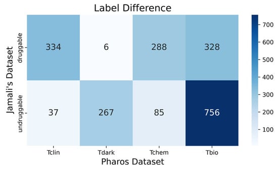 We kept Jamali’s dataset in its entirety, which was also adopted by many other research papers [,,,]. For the Pharos dataset, we encountered a distinction where “Tdark” represented the unstudied proteins, while “Tbio” and “Tchem” exhibited varying degrees of druggability. To address this ambiguity, we conducted two methods on this dataset.