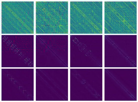 Protein contact maps. The first row is the underfitting ESM-2 model, the second row is the fine-tuned one on Jamali’s dataset, and the third row is the original ESM-2 model. For each row, it is labeled as undruggable protein (Jamali’s dataset), druggable protein (Jamali’s dataset), undruggable protein (Pharos dataset), and druggable protein (Pharos dataset). For each column, the protein is the same.