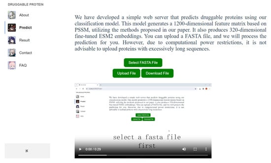 Previous research has significantly advanced our understanding of druggable proteins. To make the latest findings accessible, some researchers have developed web servers. For example, Jamali et al. established a web server (https://www.drugminer.org/ (accessed on 19 March 2024)) that enables users to explore druggable proteins identified in their research, along with the comprehensive dataset utilized. Similarly, Arwa Raies et al. introduced a web application (http://drugnomeai.public.cgr.astrazeneca.com (accessed on 19 March 2024)) that allows for the visualization of druggability predictions and essential features that determine gene druggability, categorized by disease type and modality []. Inspired by these state-of-the-art efforts, we have launched a web server available at https://www.druggableprotein.com (accessed on 19 March 2024). Current web servers related to druggable proteins are shown in Table 6. The web application interface is shown in Figure 8. Running on a computer with 1 core and 2 GB of RAM, this platform offers users the capability to upload FASTA files for prediction, as well as to generate fine-tuned ESM-2 embeddings and 1200D PSSM embeddings.