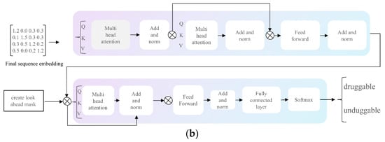 We modified the GPT-2 model, which is written in Pytorch framework (https://github.com/karpathy/nanoGPT (accessed on 19 March 2024)). The model started by encoding the protein sequence into a unified representation, where the final embedding was obtained by summing position embeddings and token embeddings (Figure 12a). These embeddings were then transformed through a series of self-attention and feed-forward neural network layers (transformer blocks), and finally, a softmax function was applied to generate probabilities for the two classes (Figure 12b). The modified architecture introduced a novel aspect by adapting GPT-2, initially designed for language understanding, to effectively capture intricate patterns in protein data.