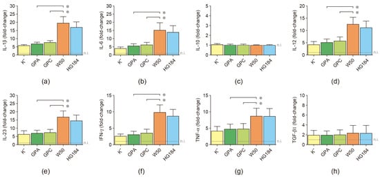 To ratify the association between the encapsulation of P. gingivalis and induction of a particular dendritic cell subset, the mRNA expression for IL-1β, IL-6, IL-10, IL-12, IL-23, IFN-γ, TGF-β1, and TNF-α was quantified by RT-qPCR (Figure 5). When the encapsulated W50 wild-type strain of P. gingivalis was used for dendritic cell stimulation, significantly higher expression levels of IL-1β, IL-12, IFN-γ, and TNF-α (Th1-type cytokines), and IL-6 and IL-23 (Th17-type cytokines) were detected, compared to dendritic cells stimulated with the non-encapsulated GPA or GPC mutant strains. The increased levels of these Th1 and Th17-type cytokines detected in the dendritic cells stimulated with the W50 strain were similar to those detected in dendritic cells stimulated with the encapsulated HG184 strain of P. gingivalis. These cytokines were also expressed similarly between GPA- or GPC-stimulated and K−-stimulated dendritic cells. No differences were detected in the mRNA expression for IL-10 and TGF-β1.
