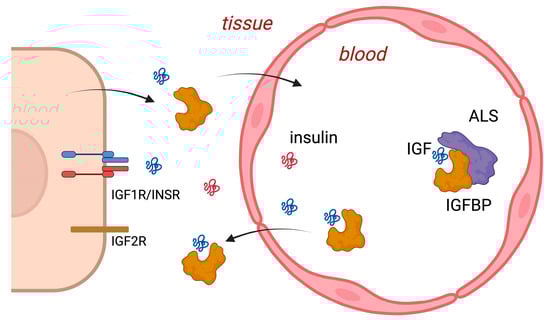 Ubiquitously expressed, tissue IGFs are derived from both endocrine and paracrine sources []. The endocrine role of these (~7 kDa) proteins depends on their availability in the circulation, where they associate in binary forms with IGFBP-1 to -6 (~25–45 kDa) that can cross the endothelium or tertiary forms (~140 kDa) with IGFBP-3 or -5, together with an acid-labile subunit (ALS) that is retained in the circulation (see Figure 1). Systemic circulating IGFs are available to the central nervous system by crossing fenestrated and sinusoidal capillaries, including those of the anterior pituitary, where they inhibit growth-hormone-releasing hormone (GHRH)-stimulated GH release, as well as the blood–brain barrier (BBB) [] to directly inhibit hypothalamic GHRH secretion and other actions. While initially controversial, there is now a good understanding of the mechanisms by which peptides cross the BBB [,]. IGF-I not associated with IGFBPs crosses the BBB via interaction with the endothelial transporter lipoprotein-related receptor (LRP)-1 [], independently of IGF receptors. This interaction is enhanced by neuronal activity in relation to vasodilatation.