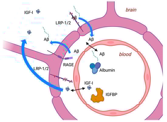 Transport of β-amyloid (Aβ) and insulin-like growth factor (IGF)-I at the blood–brain barrier involves interaction with lipoprotein receptor 1 and 2 (LRP1/2) and the receptor for advanced glycation end products (RAGE). Aβ associates with carrier proteins such as albumin and IGF-I with IGF-binding proteins (IGFBPs). Created with Biorender.com.