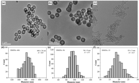 HMSNs under investigation. TEM images of (a) HMSNs-406, scale bar: 1 µm; (b) HMSNs-96, scale bar: 200 nm; and (c) HMSNs-19, scale bar: 500 nm. Particle size distributions of (d) HMSNs-406, (e) HMSNs-96, and (f) HMSNs-19 based on the TEM image analysis. Averages ± standard deviations.