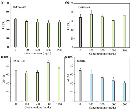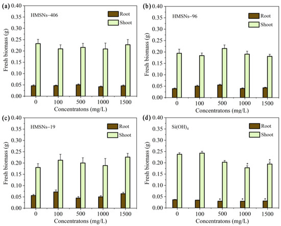 Previous studies [10,12,19] have revealed that SiO2NPs are beneficial to seed germination and plant growth within appropriate concentration ranges. Thus, we first explored the effects of three synthesized HMSNs at different concentrations (100, 500, 1000, and 1500 mg/L) on seed germination and growth using a germination index (GI), and the root and shoot fresh biomass of seedlings as the indicators. As illustrated in Figure 2a–c, HMSNs-19 improved seed germination at 1000 mg/L with a higher GI value compared with the control, while the other two HMSNs, as well as HMSNs-19 at other concentrations, exhibited no significant effects on cowpea seed germination. Si(OH)4, however, showed a concentration-dependent inhibition of seed germination with declining GI values along with an increase in the concentration (Figure 2d). Compared with the control, seed germination was significantly inhibited when the concentration of Si(OH)4 exceeded 500 mg/L. In addition, the three HMSNs also exhibited no adverse impacts on the seedling growth, showing no significant differences in the root and shoot biomass at the test concentrations relative to the controls (Figure 3a–c). However, the root biomass was significantly decreased by Si(OH)4 at concentrations exceeding 500 mg/L and the shoot biomass was also significantly decreased by Si(OH)4 at a high concentration of 1000 or 1500 mg/L (Figure 3d). Overall, these results indicate that the three HMSNs pose no adverse effects on both the cowpea seed germination and seedling growth while Si(OH)4 can produce stress effects on both the seed germination and seedling growth at higher concentrations exceeding 500 or 1000 mg/L.