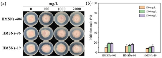The direct suppression of the three HMSNs against F. oxysporum f. sp. phaseoli (FOP) growth was determined by the previously reported agar dilution method [48] using the mycelial growth inhibition as the indicator. Briefly, stocks of the three HMSNs were prepared by ultrasonic dispersion in sterile water to gain the final concentrations of 1, 10, and 20 mg/mL, respectively. Each stock solution (5 mL) was added to molten PDA (50 mL) at a temperature below 50 °C. After sufficient mixing, the mixture was poured immediately into 90 mm Petri dishes to form plates of 2–3 mm thickness with final HMSNs concentrations of 100, 1000, and 2000 mg/L. PDA plates supplemented with sterile water served as the controls. Afterwards, a 5 mm diameter mycelial disc from the actively growing colony front of FOP was then placed in the center of each plate with the inoculum side down. All the plates were then incubated in the dark at a constant temperature of 25 °C for 7 days. Each treatment was performed in triplicate. The mycelial growth diameters were measured and subsequently converted into the inhibition rates according to the following Equation (2):