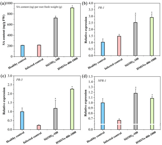 Pathogenesis-related (PR) genes including PR-1 and PR-5 are commonly used as markers for salicylic acid-mediated activation of SAR [7,30]. To further verify SA-dependent SAR induced by foliar treatment of HMSNs-406, we quantified the expression of PR-1 and PR-5 in FOP infected cowpea roots. Similar to treatment with Si(OH)4 (100 mg/L), treatment with HMSNs-406 (1000 mg/L) resulted in 1.97- and 9.38-fold increases in PR-1 (Figure 6b) and PR-5 (Figure 6c) in the transcript abundance, respectively, relative to the infected control. Non-expressed pathogen-related gene 1 (NPR-1) has been reported to be a receptor for salicylic acid and positively regulate the expression of PR genes [30]. Thus, NPR-1 expression was also measured to clarify whether this upstream gene participated in the HMSNs-406-activated SAR. Foliar exposure of HMSNs-406 (1000 mg/L) boosted the expression level of NPR-1 by 1.62-fold in the cowpea roots compared with the infected control, as did the Si(OH)4 (100 mg/L) by 1.76-fold (Figure 6d). Phenylalanine ammonia lyase gene (PAL), an antioxidant defense-related enzyme gene, is also associated with the response to pathogen-induced stress [29,31]. In cowpea infected roots, there was significant upregulation of PAL (8.54-fold) with HMSNs-406 foliar exposure (Figure S2), consistent with previously reported works [29,31]. These findings indicate that HMSNs-406, similar to Si(OH)4, can activate SA-dependent SAR defense in FOP infected cowpea plants.