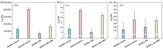 We further investigated the effects of HMSNs-406 on the activity of disease-related enzymes in cowpea roots to characterize the impacts of cowpea SAR. As shown in Figure 7, FOP infection significantly increased the POD activity by 2.22-fold in cowpea roots. The POD activity in the foliar HMSNs-406-treated cowpea roots was significantly decreased by 59.81% as compared with the infected control. Also, Si(OH)4 treatment led to a POD activity decline of 83.23%. This is likely because POD was reverted to the level of the healthy control after the suppression of pathogen activity and damage by HMSNs-406 and Si(OH)4 [29,31]. The change trends of the activity of the other two antioxidant enzymes, PAL and PPO (polyphenol oxidase), were similar to that of POD in FOP-infected roots, despite lesser difference magnitudes (Figure 7).