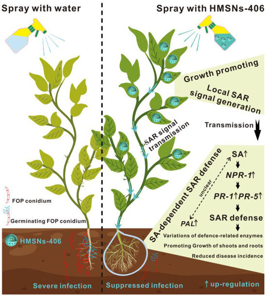 Foliar spray of HMSNs-406 enhanced FOP resistance in cowpea roots via the SA-dependent SAR defense pathway.