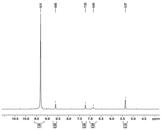 1H NMR (CDCl3) (Figure S3) δ, ppm, reaction product after 10 h heating: δ = 1.42 ppm, d, 3J(H,H) = 7.07 Hz for -C(O)CH(CH3) protons; 1.60 ppm, d, 3J(H,H) = 6.83 Hz, POCH(CH3)C(O)-; 1.58 ppm, 3J(H,H) = 6.83 Hz, -POCH(CH3)C(O)-; 3.64, s, -CH2OCH2; 4.13–4.37 ppm, m, OCH2CH2OP(O)(H)OCH2CH2-. 4.99–5.06 ppm, m, POCH(CH3)-protons; 6.83–7.21 for aromatic protons; δ = 6.95 ppm, d, 1J(P,H) = 717.69 Hz. OCH2OP(O)(H)OCH2; δ = 7.02 ppm, d, 1J(P,H) = 729.40 Hz for OCH2OP(O)(H)OCH(CH3); δ = 7.13 ppm, d, 1J(P,H) = 734.8 Hz for OCH2OP(O)(H)OCH(CH3); δ = 7.16 ppm, d, 1J(P,H) = 724.76 Hz for PhOP(O)(H)OCH2-; 31P{H} NMR (Figure 4) (CDCl3), δ ppm,: 9.31 ppm with integral intensity (II) = 1.00; 8.62 ppm, II = 0.06; 7.32 ppm, II = 0.06; 6.85 ppm, II = 0.06 and 5.37 ppm, II = 0.12. The ratio between the integral intensity of the signals at 9.31 ppm and (8.62 ppm and 7.32 ppm) is 1: 0.12 = 8.33. 31P NMR (CDCl3) (Figure S4), δ ppm: 9.31 ppm, doublet of quintets with 1J(P,H) = 737.6 Hz, and 3J(P,H) = 10.0 Hz, CH2OP(O)(H)OCH2; 8.62 ppm, dq, with 1J(P,H) = 751.98 Hz, and 3J(P,H) = 7.47 Hz and 7.23 dq, with 1J(P,H) = 747.0 Hz, and 3J(P,H) = 7.47 Hz, CH2OP(O)(H)OCH(CH3)-. 6.85 ppm, dt, with 1J(P,H) = 727.0 Hz, HO-P(O)(H)OCH2; 5.37 ppm, dt, with 1J(P,H) = 744.51 Hz, and 3J(P,H) = 10.0 Hz, PhO-P(O)(H)OCH2-.