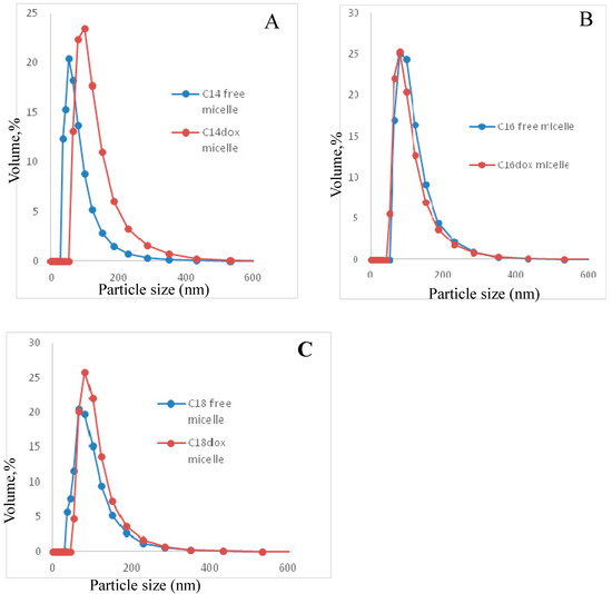 The results indicate that the newly synthesized polymers self-assembled into the micellar structure in an aqueous solution and micelles show monodisperse peaks. Micelle size increases with the increasing molecular weight of the polymer and hydrophobicity. It was established that an increase in molecular weight and hydrophobic components of the diblock copolymer produced larger micelles [46]. In the case of C14, when DOX was encapsulated, the particle size increased significantly compared to the empty micelle, while in the case of C16 and C18, no significant change was observed in DOX-encapsulated micelles and empty micelles. It was established that the size of indomethacin (IMC)-loaded micelles is larger than MePEG/ε-CL block copolymeric micelles without incorporating IMC [46]. We hypothesize that the significant increase in micelle size at C14 is due to a weaker hydrophobic interaction between the drug and the polymer, which decreased the cohesive force in the inner core of the micelle and increased the micelle size. In addition, with respect to the size of the micelles, their volume at C14 is the smallest, so the addition of DOX will also lead to an increase in the size of the micelles. For C16 and C18, the addition of the drug did not significantly affect the hydrophilic–hydrophobic balance and no significant increase in micelle size was observed. The particle size distribution of DOX-encapsulating micelles was monodisperse (Figure 2) and the size was sufficient to exhibit the EPR effect.