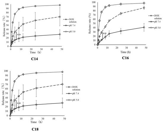 The cumulative release rate of DOX using C14, C16, and C18 polymers. (n = 3, mean ± S.D., ** p < 0.01,Tukey’s test).