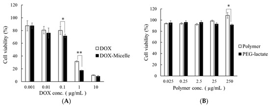 Cell viability of B-16 melanoma cells treated with DOX and DOX-micelle (A), and polymer and Peg-lactate (B) (n = 3, mean ± SD, * p < 0.05, ** p < 0.01, t-test).