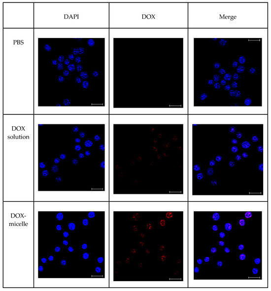 Cell uptake was observed using DOX-micelle. B16 melanoma cells, which are mouse-derived malignant melanoma cells, were seeded on a culture slide with a chamber at a concentration of 1.0 × 105 cells/mL, and then incubated for 24 h under conditions of 5% CO2/air and 37 °C, and the cells were plated. Doxorubicin and DOX-micelle (5.0 µg/mL) were each seeded and incubated for 2 h. Thereafter, the supernatant was discarded, and particles adhering to the cell surface were washed with PBS (−), and 4% paraformaldehyde was added for fixation. After adding TritonX100 (0.1%) and washing, staining was performed with 50 µL/well DAPI. This was washed, dried, and observed using a confocal laser microscope. The fluorescence intensity of Doxorubicin was set between 488 and 575 nm, and the fluorescence intensity of DAPI was set between 345 and 455 nm [52].