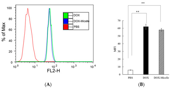 FACS histogram of B-16 melanoma cells treated with DOX and DOX-micelle (A), mean fluorescence intensity (MFI) (B) (n = 4, mean ± SD, ** p < 0.01, Tukey’s test).