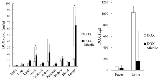 Biodistribution of DOX in tumor-bearing mice 24 h after treatment with free DOX and DOX-micelle (n = 3, * p < 0.05, t-test).