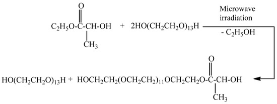 PEG600 (53.2 g, 8.8 × 10−2 mol) and ethyl lactate (5.2 g, 4.4 × 10−2 mol) were added to a two-necked round-bottomed flask, equipped with a magnetic stirring bar, inlet adaptor for inert gas, and vacuum condenser. The reaction was carried out under microwave irradiation conditions at 40 °C for 8 h under power (90 W) and reduced pressure (350 mmHg). Then, a reduced pressure treatment (0.8 mmHg) was carried out at 120 °C for 1 h, nitrogen was sealed in a two-necked flask, and the reaction was stopped. After that, the reaction mixture was subjected to a vacuum (1 mm Hg) at 60 °C. The yield of poly(ethylene glycol)lactate was 94% (27.8 g 4.1 × 10−2 mol).