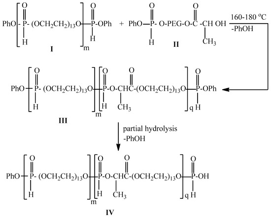 In the temperature range of 160–185 °C, the secondary hydroxyl group of II will also participate in a transesterification reaction. The reaction between I and II will lead to the formation of polymer III (Scheme 4). The ratio between the integral intensities of the phosphorus in the end group and the phosphorus atom in the repeating unit is 1:0.06, i.e., m is equal to 16 (Figure 1). The ratio between the phenoxy group and the lactate-containing units is 0.12:0.06, i.e., q is 2. Molecular weight (Mw) based on 31P{H} NMR spectrum is (m = 16, Mw of repeating unit 646 g/mol; q = 2, Mw of repeating unit 718 g/mol) 11,772 g/mol. GPC gives 11,179 g/mol, PDS = 1.33. The hydrophilicity of the poly[poly(ethylene glycol) H-phosphonate-b-poly(ethylene glycol)lactate–H phosphonate] IV is determined by the poly(ethylene glycol), the phosphoryl group, which is a strong proton acceptor [44], and by the carbonyl group of lactic acid, which is a proton acceptor, too. By varying the ratio between m and q, we can control the hydrophilicity of the copolymer.