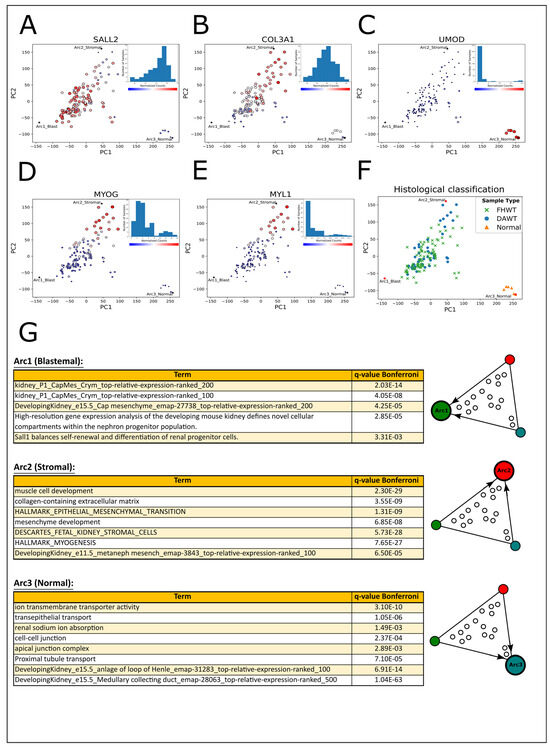 High-risk Wilms’ tumors and normal kidney samples form a triangle-shaped continuum in latent space that is bounded by archetypes with stromal, blastemal, and epithelial characteristics that resemble the nephrogenic stroma, the cap mesenchyme, and early epithelial structures of the fetal kidney, respectively. (A–C) Shown are PCA plots of RNAseq gene expression profiles from 130 high-risk Wilms’ tumors (relapsed favorable histology or diffuse anaplastic Wilms’ tumors) and six normal kidneys from the US NCI TARGET project. Three archetypes, denoted in the plots by asterisks and labeled “Arc1_Blast”, “Arc2_Stromal”, and “Arc3_Normal”, form the vertices of the best fitting polytope which encompasses all data points. To identify the archetypes, the size and color of each sample (dot) are drawn according to expression levels of known genes marking the cell populations of the fetal developing kidney (large red—high expression; small blue—low expression). Histograms of gene expression levels are included in each PCA subplot. The gene SALL2, which marks the cap mesenchyme, is highly expressed near Arc1, which is the “blastemal” archetype. The gene COL3A1, which marks the nephrogenic stroma, is highly expressed near Arc2, which is the “stromal” archetype. Likewise, UMOD, a gene which is highly expressed in the epithelial cells of the loop of Henle, is highly expressed in the normal samples located near Arc3, which is the “normal” archetype that is predominantly epithelial. (D,E) MYOG, a transcription factor that can induce myogenesis, and MYL1, a gene that encodes a muscle motor protein, are highly expressed near the “stromal” archetype (Arc2_Stromal). (F) A PCA plot with each sample marked according to its histological classification. We did not observe a significant separation between relapsed favorable histology Wilms’ tumors (FHWTs) and diffuse anaplastic Wilms’ tumors (DAWTs) in this dataset. (G) Genes overexpressed (log2FC > 3) in each of the three archetypes with respect to both of the other two were used as input for Gene Ontology enrichment analysis. Arc1, the “blastemal” archetype, overexpresses genes related to the cap mesenchyme and nephron progenitor cells. Arc2, the “stromal” archetype, overexpresses genes that are related to the extracellular matrix, the nephrogenic stroma (the un-induced metanephric mesenchyme), and muscle development. Arc3, the “normal” archetype, overexpresses genes that are related to the structure and function of epithelial lineages of the kidney.