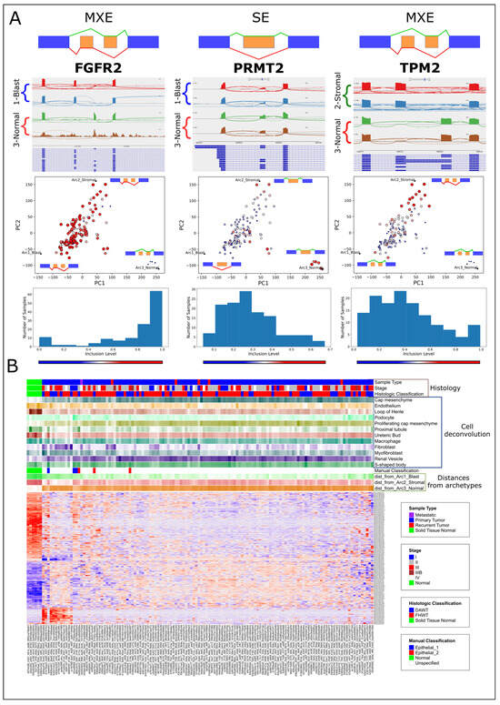 RNA transcripts related to EMT and muscle development are alternatively spliced between high-risk Wilms’ tumors located in different regions of latent space. (A) Sashimi plots (top), feature plots (middle), and inclusion-level histograms (bottom) for the alternatively spliced genes FGFR2, PRMT2, and TPM2. The sashimi plots show representative samples that are located near the archetypes (denoted by asterisks). The feature plots show the isoform inclusion levels in the different tumors and samples in latent space, where the size and color of each sample are drawn according to the inclusion levels of a particular isoform (large red—high; small blue—low). (B) A heatmap showing the inclusion levels of 277 significantly skipped/included exons (SEs) and mutually exclusive exons (MXEs) for transcripts that were found to be significantly alternatively spliced in latent space. The rows are the union of all significant alternative splicing events (FDR = 0, ) from each of the three comparisons between the five nearest neighbors of the three archetypes. We plotted only SE (single-exon) and MXE (mutually exclusive exon) splicing events since these were the majority. The top panels show clinical and histological information, the proportions of cell types in each sample as predicted by cell deconvolution, our manual classification based on tumor location in latent space, and the distances to each of the three archetypes (for cell deconvolution and distances to archetypes: light color—low; dark color—high).