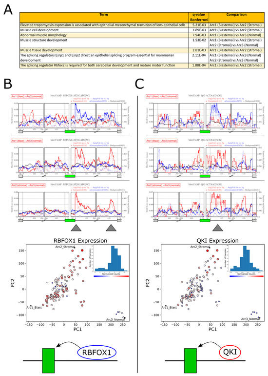 Motif enrichment analysis reveals putative RNA binding proteins (RBPs) regulating alternative mRNA splicing between Wilms’ tumors located in different regions of latent space. (A) Gene Ontology (GO) enrichment analysis for exons that were found to be significantly alternatively spliced (FDR = 0, ) in latent space, as identified from the three comparisons between the five nearest neighbors of the three archetypes. A significant fraction of these transcripts are related to the epithelial-to-mesenchymal transition (EMT) and muscle development. (B,C) Motif enrichment diagrams (top) and expression feature plots (middle) for the splicing regulators RBFOX1 and QKI. Histograms of RBFOX1 and QKI expression levels are included in each PCA subplot (archetypes denoted by asterisks). It can be seen that the expression levels of these RNA binding proteins are elevated in the blastemal, and even more in the stromal tumors. Independently, we observed that exons that are elevated in these tumors are enriched for binding motifs of these regulators at their downstream introns. This indicates that in these tumors, RBFOX1 and QKI bind to the mRNA downstream of the mesenchymal-associated cassette exons and promote their inclusion (bottom sketch).
