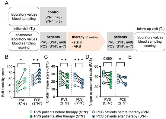 Study design and well-being of PVS and PCS patients before and after therapy. (A) Scheme of the study design. Presentation of the scores of different standardized questionnaires in PCS patients. (B) Bell disability score, (C) Chalder fatigue scale, (D) fatigue assessment scale and (E) SF-36 physical functioning. * p < 0.05, ** p < 0.01, *** p < 0.001. PVS = post-vaccination syndrome, PCS = post-COVID-19 syndrome, S = spike protein, N = nucleocapsid protein, ARB = angiotensin II receptor blocker, SF = short-form health survey.