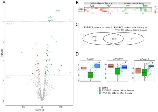 Differentially abundant proteins in the HDL proteome of PVS/PCS patients after therapy. Differentially abundant proteins in the HDL of PVS/PCS patients after therapy compared to before therapy (FDR < 0.05) are presented as (A) volcano plot and as (B) heat map. More abundant proteins are shown in green and less abundant proteins are shown in red. (C) Differentially abundant proteins across all comparisons are plotted in a Venn diagram. (D) FAM3 metabolism-regulating signaling molecule C (FAM3C), ATPase H+ transporting accessory protein 2 (ATP2AP6), and disintegrin and metalloproteinase domain-containing protein 10 (ADAM10) protein levels in the HDL proteome of all study groups are shown as box plot. * FDR < 0.05 vs. control, # FDR < 0.05 vs. PCS. PVS = post-vaccination syndrome, PCS = post-COVID-19 syndrome, S = spike protein, N = nucleocapsid protein, FC = fold-change, HDL = high-density lipoprotein.