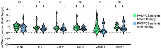 To test if HDL-associated proteins from PVS/PCS patients before and after treatment had different stimulatory effects, human endothelial EAhy 926 cells were exposed in vitro to 100 µg/mL of HDL protein samples of both groups and subsequently analyzed regarding their inflammatory capacity. This was carried out through an analysis of cytokine and adhesion molecule expression by real-time PCR. Endothelial cell expression of interleukin (Il)-6, tumor necrosis factor (Tnf)-α, and vascular cell adhesion molecule (Vcam)-1 was significantly attenuated in EAhy 926 cells exposed to HDL-associated proteins from PVS/PCV patients after therapy as compared to before therapy (Figure 4), suggesting a reduced inflammatory potential of the HDL proteome after therapy.