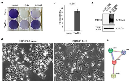 Sensitivity to taxol and morphology of the naïve HCC1806 cell line and the taxol-resistant subline HCC1806-TaxR. (a) Cytotoxicity assay to taxol of naïve and taxol-resistant HCC1806 cells (72 h); (b) resistance of HCC1806-TaxR and HCC1806 cells to taxol, IC50, cytotoxicity assay, Mann–Whitney U test, asterisks indicate p-values < 0.01 (**); (c) P-glycoprotein (MDR1) expression in HCC1806 and HCC1806-TaxR cells, Western blotting analysis; (d) phenotype of HCC1806-TaxR and HCC1806 cells in vitro, phase contrast microscopy, scale bar 50 μm; (e) the interaction map for β- and γ-cytoplasmic actins (ACTB and ACTG1, respectively), tubulin (TUBB), and MDR1 (ABCB1), based on bioinformatics analysis and RNA profiling data (https://string-db.org/; accessed on 9 November 2023). Each line indicates one of the different methods that have shown the interaction between proteins, the products of the genes mentioned.