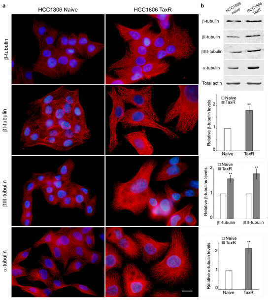 The reorganisation of the microtubule system and tubulin’s levels in the naïve and taxol-resistant HCC1806 cells. (a) Microtubules organisation in HCC1806-naïve and HCC1806-TaxR cells, immunofluorescence microscopy, scale bar 10 μm; (b) expression of tubulin isotypes in HCC1806-naïve and HCC1806-TaxR cells, Western blotting analysis, Mann–Whitney U test. Asterisks indicate p-values < 0.01 (**) for all panels.