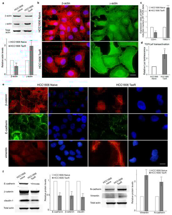 The cytoplasmic actins and adhesion junction proteins in the naïve and taxol-resistant HCC1806 cells. (a) Western blot analysis of cytoplasmic actins in HCC1806-naïve and HCC1806-TaxR cells; (b) immunofluorescence microscopy of cytoplasmic actins in HCC1806 and HCC1806-TaxR cells, red—cytoplasmic β-actin, green—cytoplasmic γ-actin, blue—DNA; (c) comparison of the expression of CDH1 and TWIST1 in HCC1806-naïve and HCC1806-TaxR cells, RT PCR analysis; (d) TCF/Lef transactivation, Luciferase luminescence analysis; (e) immunofluorescence microscopy of E-cadherin, β-catenin and vimentin in HCC1806-naïve and HCC1806-TaxR cells, red—β-catenin, green—E-cadherin, blue—DNA. Scale bars 10 μm; (f) Western blot analysis of EMT-related proteins E-Cadherin, β-Catenin, claudin-1 (left), N-Cadherin, vimentin (right) in HCC1806-naïve and HCC1806-TaxR cells. Mann–Whitney U test in (a–d). Asterisks indicate p-values < 0.01 (**) or <0.001 (***) for all panels.
