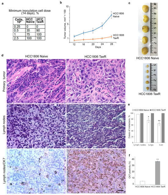 Tumour growth rates of the naïve HCC1806 and HCC1806-TaxR cells in vivo in xenografts. (a) The minimum inoculation dose for HCC1806-TaxR and HCC1806-naïve cells; (b,c) tumour growth in vivo in xenografts after subcutaneous injection, BALB/c athymic mice model; (d) histological examination of HCC1806-naïve and HCC1806-TaxR cells and immunohistochemical (IHC) staining for human keratin CK7 in mouse lymph node sections (bottom panel), scale bar 50 μm; (e) cases of metastasis for HCC1806-TaxR and HCC1806-naïve xenografts (percentage of mice with detected metastases in different organs), Mann–Whitney U test; (f) the density of HCC1806-naïve and HCC1806-TaxR metastatic cells in the mice lymph nodes, IHC analysis for human keratin CK7, Mann–Whitney U test. Asterisks indicate p-values < 0.05 (*) or <0.01 (**) for all panels.