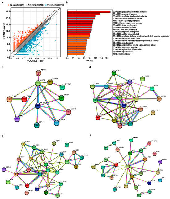 Bioinformatics analysis and visualisation of RNA profiling data for HCC1806-naïve and HCC1806-TaxR cells. (a) Scatter plot of DEGs in the naïve HCC1806 and HCC1806-TaxR cells. The X–Y axis represents the log 2-transformed gene expression level, the orange colour represents upregulated genes, the blue colour represents downregulated genes, and the grey colour represents non-DEGs. The scatter plot was generated using https://www.bioinformatics.com.cn/en accessed on 17 April 2024; (b) gene ontology enrichment analysis of upregulated genes in HCC1806-TaxR cells compared with naïve HCC1806. A heatmap of enriched terms across input differentially upregulated gene lists, coloured by p-values, Metascape software, https://metascape.org/gp/index.html#/main/step1 accessed on 9 November 2023; (c–f) The interaction “cell motility” maps for EMT (c), actin/tubulin cytoskeleton (d), extracellular matrix—ECM (e) and cell signalling (f) with ACTB/ACTG1. Each line indicates one of the different methods that have shown the interaction between proteins, the products of the genes mentioned.