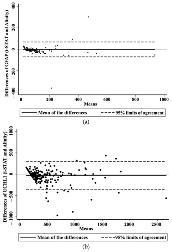 Bland–Altman plots of GFAP (a) and UCH-L1 (b) values measured by the i-STAT® and Alinity® i assays.