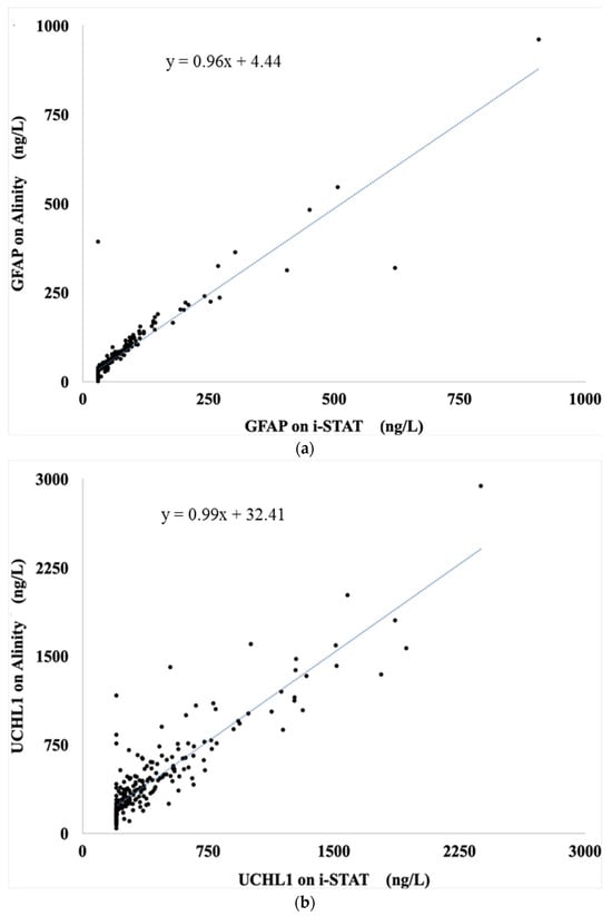 Linear regressions of GFAP (a) and UCH-L1 (b) values measured by the i-STAT® and Alinity® i assays.