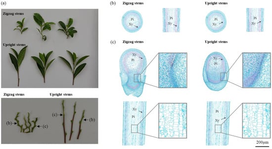 2.1. Phenotypic Characterization and Stem Tissue Sections of Erect and Zigzag-Shaped Shoots in Tea Plants