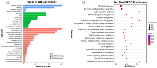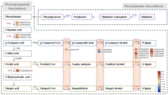 2.5. Analysis of Pathways of and Genes Related to Phenylpropane Biosynthesis
