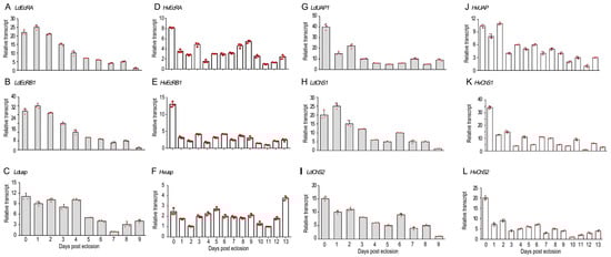 The temporal expression patterns of selected genes in the ovaries of two Coleoptera potato defoliators. The cDNA templates were derived from the ovaries of 0- to 9-day-old L. decemlineata, and 0- to 13-day-old H. vigintioctopunctata female adults, respectively. The transcript levels of EcRA, EcRB1, usp, UAP, ChS1, and ChS2 were determined. For each sample, 3 independent pools of 5–10 individuals (red dots) were measured in technical triplicate using real-time quantitative PCR. The bars represent 2−ΔΔCT value (±SD) normalized to the geometrical mean of house-keeping gene expression. The lowest transcript levels at a specific developmental time point were set as 1.