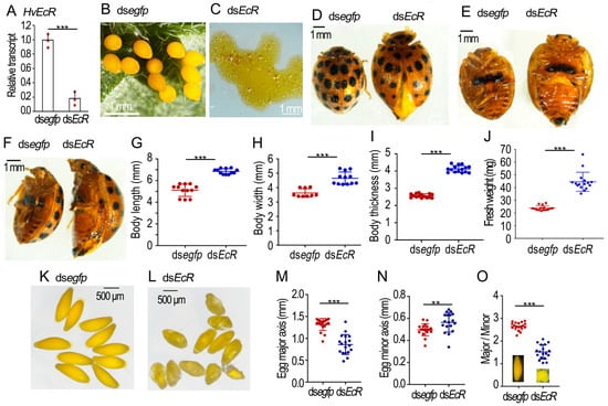 Knockdown of HvEcR in the 0-day-old Henosepilachna vigintioctopunctata female adults. The 0-day-old female adults were injected with 0.1 μL dsegfp or dsHvEcR (400 ng). The treated beetles were fed on fresh potato foliage. (A) Expression of HvEcR three days after treatment (n = 3, red dots). Relative transcript is the ratio of relative copy number in treated individuals to dsegfp-treated controls, which is set as 1. (G–J) Comparison of body sizes and fresh weights in the 30-day-old females (n = 9–12). (M–O) The egg sizes in the 30-day-old females (n = 15). The averages and SD ranges are drawn. Different stars indicate significant difference at p value < 0.01 (**), or 0.001 (***) using t test. (B–F,K,L) showed oviposited eggs, body sizes and egg shapes from 30-day-old females.