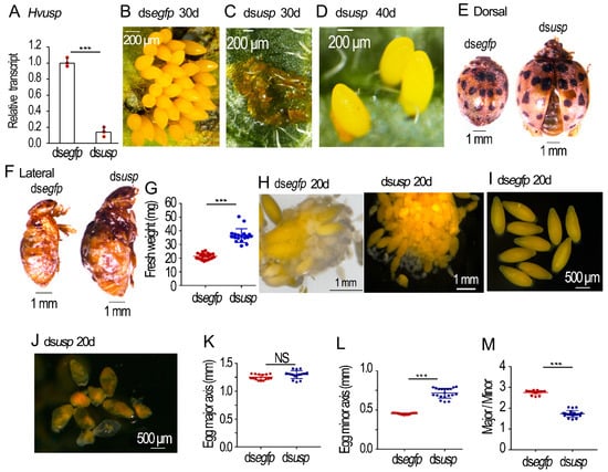 Silence of Hvusp in the 0-day-old Henosepilachna vigintioctopunctata female adults. The 0-day-old female adults were injected with 0.1 μL dsegfp and dsHvusp (400 ng). The treated beetles were fed on fresh potato foliage. (A) Expression of Hvusp three days after treatment (n = 3, red dots). Relative transcript is the ratio of relative copy number in treated individuals to dsegfp-treated controls, which is set as 1. (B–D), (E,F) and (H–J) respectively showed oviposited eggs by 30- or 40-day-old females, body sizes of 30-day-old females and egg shapes from 20-day-old females. (G) The fresh weights of the 30-day-old females (n = 18). (K–M) The egg sizes of the 20-day-old females (n = 15). The averages and SD ranges are drawn. Different stars indicate significant difference at p value < 0.001 (***) using t test. NS, no significance.