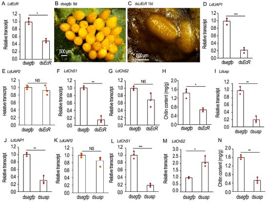 RNAi of LdEcR or Ldusp in the 0-day-old Leptinotarsa decemlineata female adults. Two biologically independent experiments were carried out using different generations, with two treatments: (1) dsegfp and (2) dsLdEcR or dsLdusp. The treated beetles were fed on fresh potato foliage. (A,D–G,I–M) Expression of LdEcR, LdUAP1, LdUAP2, LdChS1 and LdChS2, or Ldusp, LdUAP1, LdUAP2, LdChS1 and LdChS2 in the ovaries three or ten days after treatment (n = 3, red dots). Relative transcripts are the ratios of relative copy numbers in treated individuals to dsegfp-treated controls, which are set as 1. The chitin contents of the 10-day-old ovaries were measured by N-acetylglucosamine (GlcNAc) concentrations using the chitinase degraded method (H,N). The columns represent averages, with vertical lines indicating SD. Different stars indicate significant difference at p value < 0.05 (*), 0.01 (**), or 0.001 (***) using t test. NS, no significance. (B,C) The oviposited eggs by 15-day-old adult females.