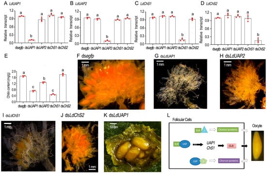 Depletion of LdUAP1 and LdChS1 significantly reduced chitin contents in the ovaries when measured with GlcNAc concentrations using the chitinase degraded method, in contrast to the control, and LdUAP2 and LdChS2 RNAi specimens (Figure 6E). Moreover, no mature oocytes were seen in 10-day-old LdUAP1 and LdChS1 RNAi ovaries, in contrast to the control, and LdUAP2 and LdChS2 RNAi samples (Figure 6G,I versus Figure 6F,H,J). A total of twenty days after treatment, the LdUAP1 and LdChS1 RNAi female adults began to lay turbid liquid, along with a few deformed eggs (Figure 6K).