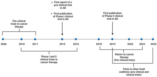 Timeline of pre-clinical and clinical trials testing saracatinib for the treatment of different health conditions. Created with BioRender.com. Available online: http://biorender.com/ (accessed on 28 February 2024).