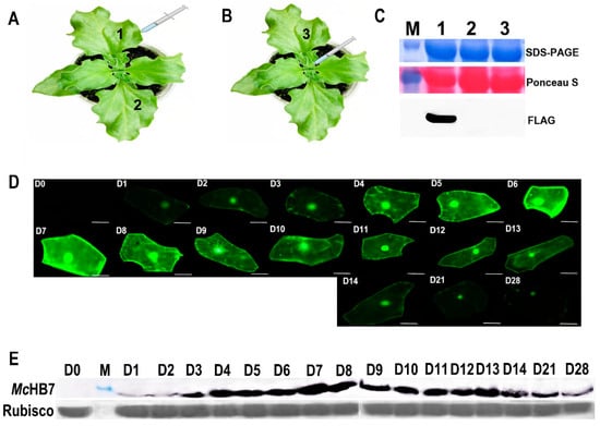 Identification of McHB7-overexpressing (OE) transgenic ice plant leaves. (A) Infiltration for ice plant transformation (1—one of the second pair of leaves from one-month-old ice plants was used for Agrobacterium infiltration and the infiltrated leaf was collected for protein extraction; 2—the non-infiltrated leaf was collected for protein extraction). (B) The stem was infiltrated and the second pair of leaves—3 was collected for protein extraction. (C) Western blot analysis of extracted proteins from the ice plant leaves 1–3. (D) Temporal changes of the GFP signal in the epidermal cells after infiltration for up to 28 days. (E) Western blot of transgenic ice plant leaves from day 0 (D0) to day 28 (D28).